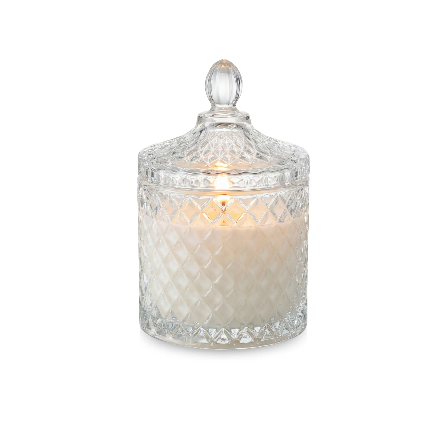 Vessel: Diamond-cut clear glass with matching lid